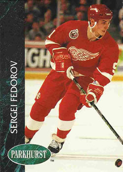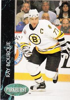 The 1992-93 Parkhurst set consists of 480 standard-size cards plus a 30-card update set. The set was released in two series of 240. The fronts feature color action player photos that are full-bleed except for one edge that is bordered by a dark blue-green marbleized stripe. The Parkhurst logo overlays the stripe. The backs have a bluish green background and carry small close-up shots, biographies, statistics, and career highlights in French and English. The second series featured traded players in their new uniforms as well as 35 Calder Candidates. The cards are checklisted alphabetically according to teams.