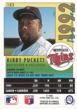 The 1992 OPC Premier baseball set consists of 198 standard-size cards. The fronts feature a mix of color action and posed player photos bordered in white. Gold stripes edge the picture on top and below, while colored stripes edge the pictures on the left and right sides. The player's name, position, and team appear in the bottom white border. In addition to a color head shot, the backs carry biography and the team logo on a panel that shades from green to blue as well as statistics on a black panel.