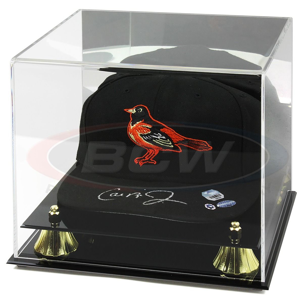 The BCW Deluxe Acrylic Cap/Hat Display Case features a black base with gold risers, clear cover, and a mirrored back. Use this memorabilia holder to protect, store and display your collectible baseball hats, football hats and others.